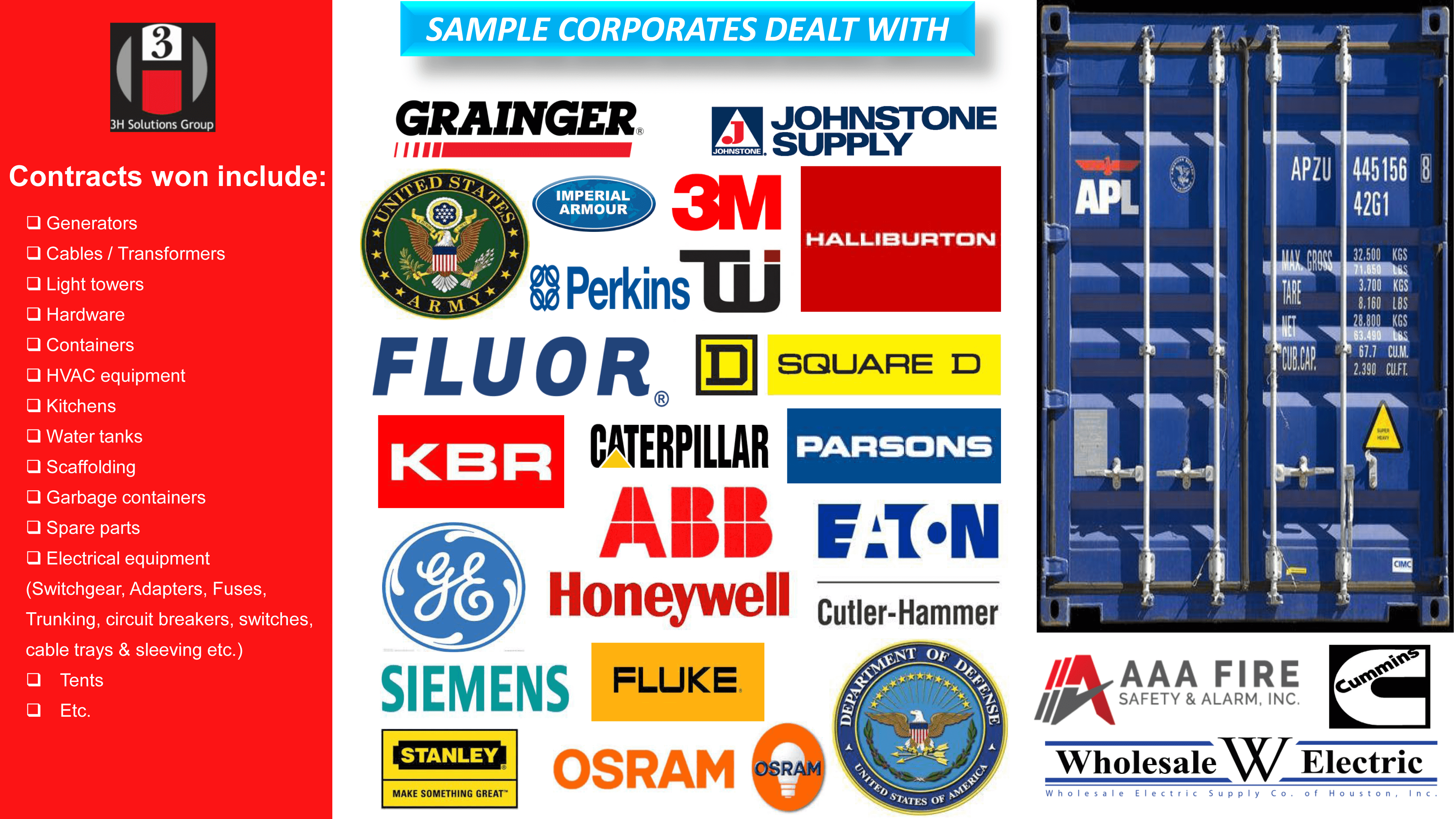 3h Solutions is a Dubai-based general trading company with an office located in Houston, Texas, USA which provides procurement & logistical support for our operations. We have provided support to corporations across Iraq, Afghanistan, Turkey, Uzbekistan and other countries in the Middle East & Africa.